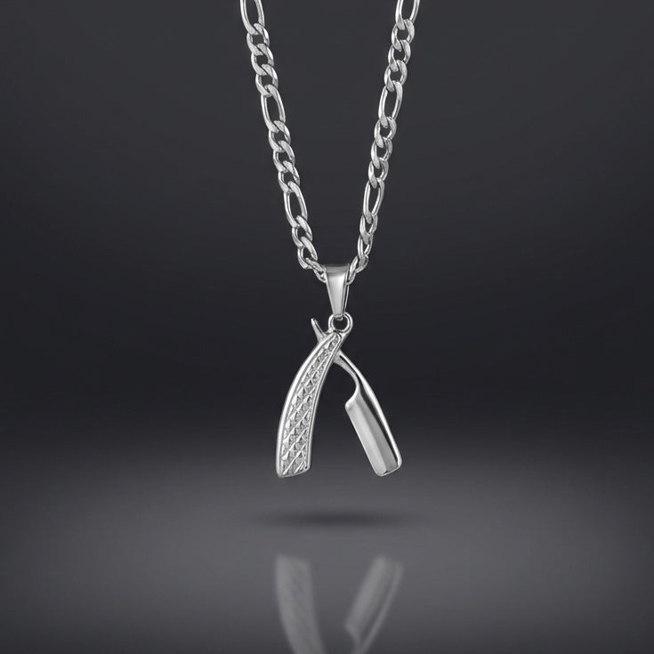 El dije de cuchilla de barberÃa en acabado plateado representa disciplina, carácter y respeto por el oficio.